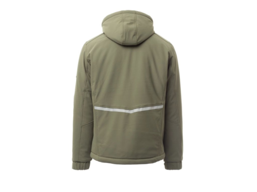 WP 8000 mm H₂O, WVT 5000 g/m2 24h Pánsky 3-vrstvový softshell s teplou výplňou (160g/m2), s flísovými vložkami na golieri, zapínanie na SBS zips s kovovým bežcom „semi-auto lock“ a ťahačom s logom. Odopínacia kapucňa s možnosťou nastavenia šnúrkou. Flísová vnútorná strana goliera s bočnými prvkami. Reflexné pruhy na spodnom okraji a na zadnej časti kapucne. Pružné manžety nastaviteľné suchým zipsom. Dve bočné vrecká so zipsom, jedno náprsné vrecko je s potiahnutým zipsom a druhé na ľavom ramene na zips má všitý držiak na perá. Fluorescenčné nastavovacie šnúrky. Jedno vnútorné lemované vrecko zatvorené na suchý zips. Spodný okraj sa dá nastaviť zarážkou s logom.